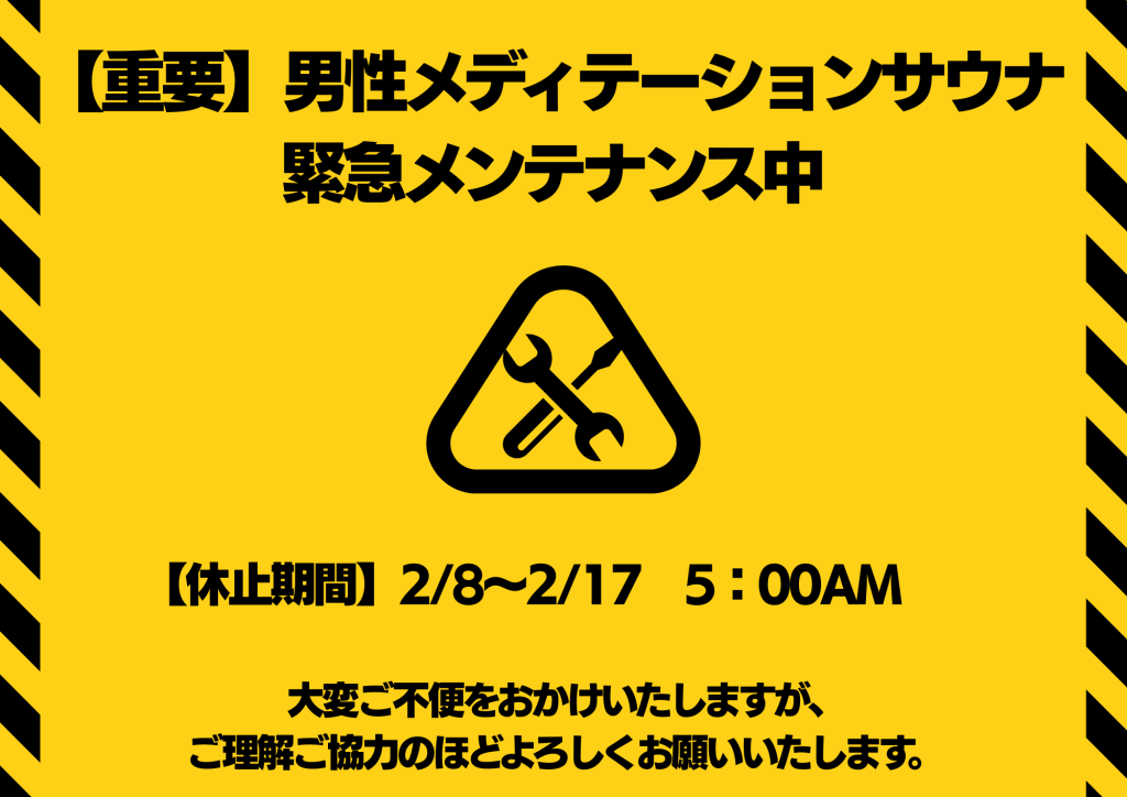 この度、設備メンテナンスのため、下記の日程におきまして男性浴室内の「メディテーションサウナ」の利用を休止させていただきます。